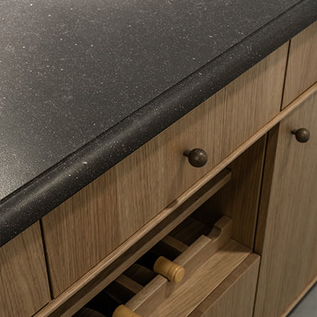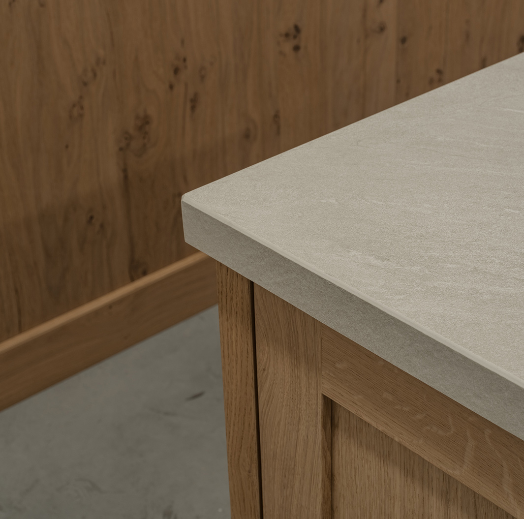 Dit hoogwaardige materiaal, afkomstig uit Brazilië, is gekozen vanwege zijn uitzonderlijke duurzaamheid en elegante uitstraling. De klant koos voor een leather-afwerking, die niet alleen een unieke textuur en subtiele glans aan het blad geeft, maar ook zorgt voor een tastbare ervaring en verhoogde weerstand tegen krassen.