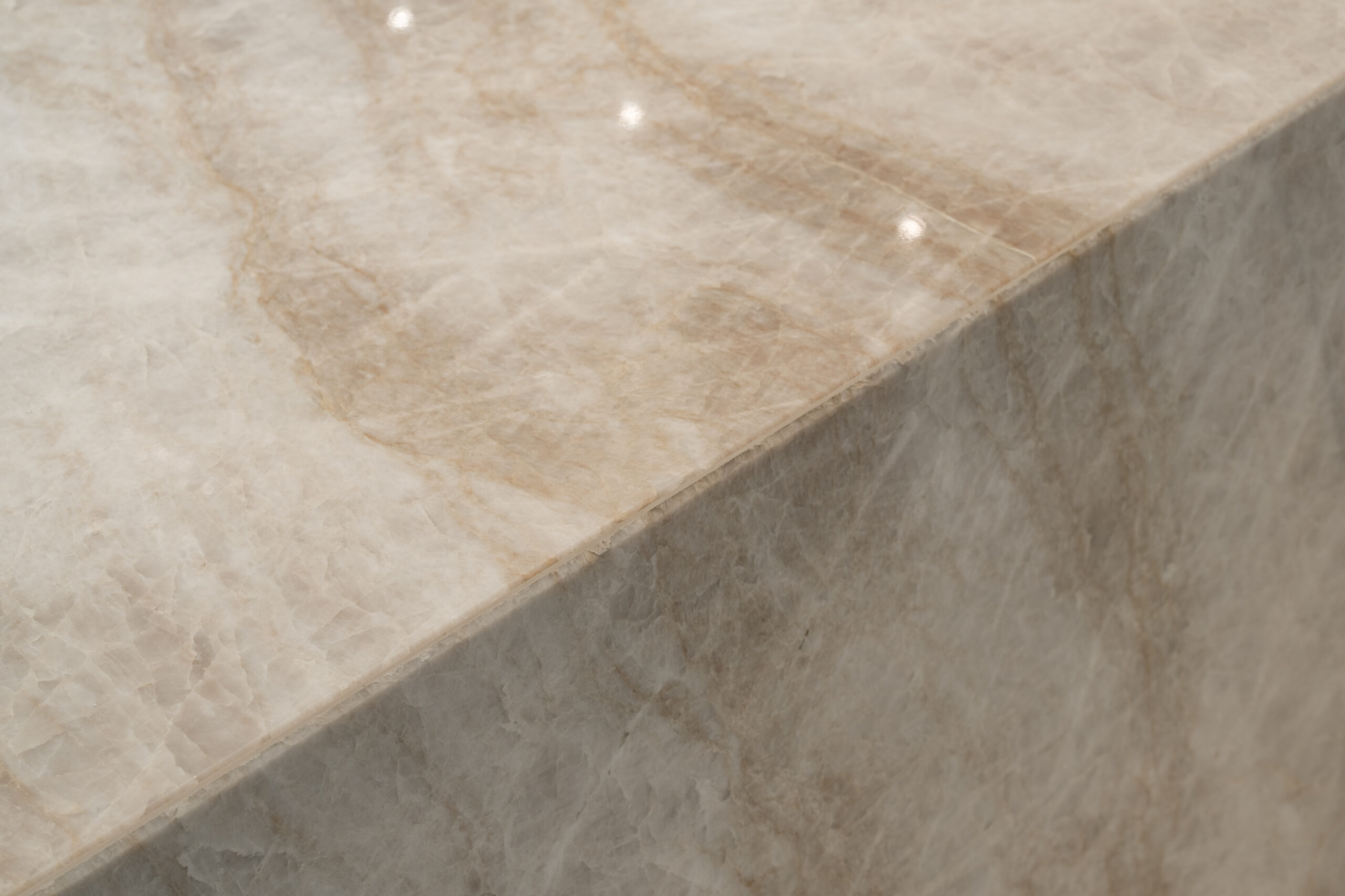 De gekozen gepolijste (blinkende) afwerking accentueert de rijke crèmekleurige tinten en elegante aders van het kwartsiet, waardoor een luxe en stralend effect ontstaat.