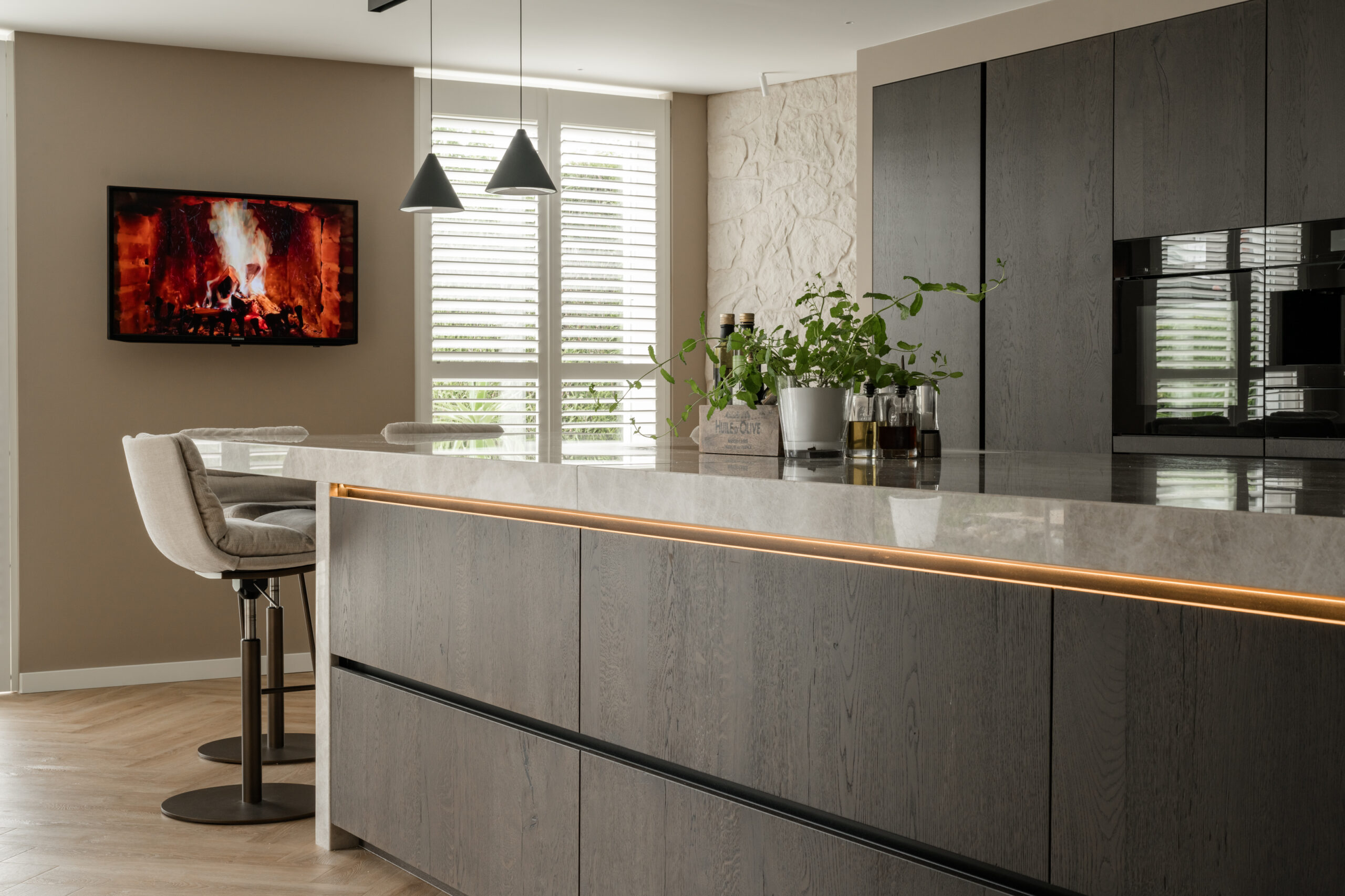 Het keukenblad werd zorgvuldig op maat verzaagd om perfect in de bestaande ruimte te passen, en de glanzende afwerking voegt een extra dimensie van luxe en helderheid toe.