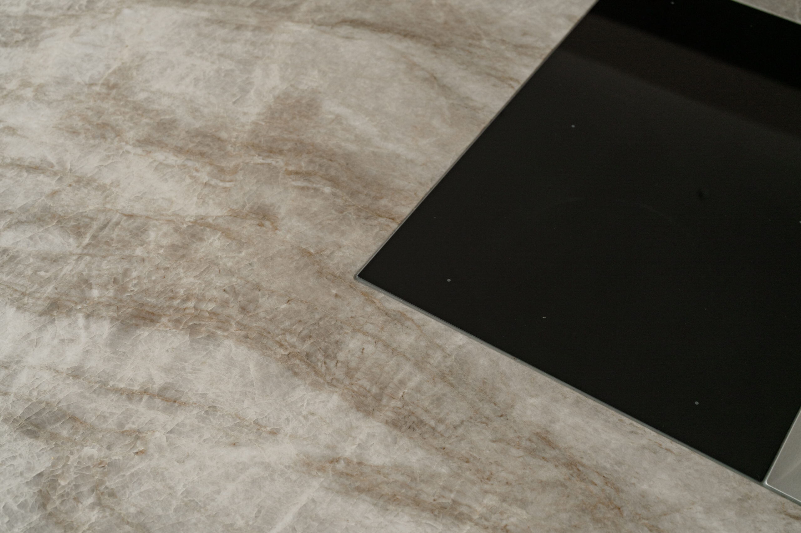 Dit indrukwekkend keukenblad werd gecreëerd uit het hoogwaardige Taj Mahal kwartsiet. Dit prestigieuze materiaal, afkomstig uit de steengroeven van Brazilië, combineert uitzonderlijke stevigheid met een verfijnde esthetiek.